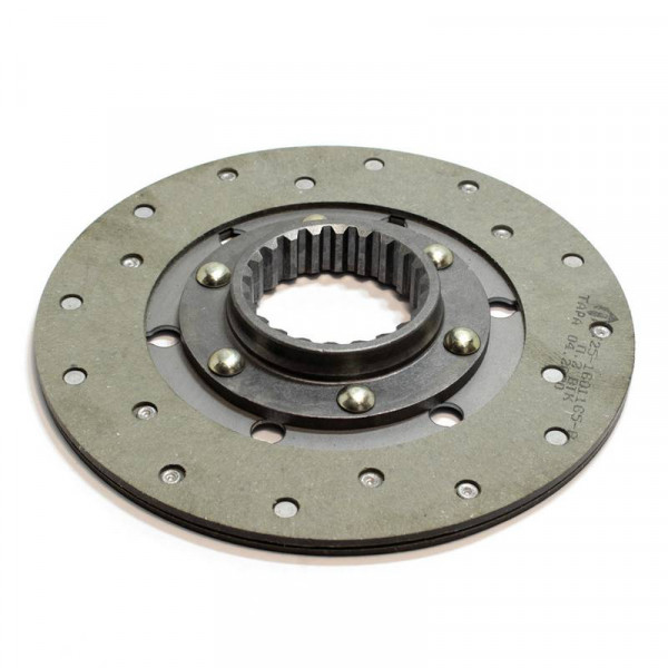 Диск сцепления муфты ВОМ Т25-1601160-В2 (жесткий) это конструкция, состоящая из ступицы с внутренним шлицевым отверстием, диска, 2-х фрикционных накладок (поз.40) и заклепок (поз.69). Конструкция жесткая, т. к. к ступице приклепывается диск, а к нему - накладки из безасбестового материала. Диск ведомый (поз.13) непрерывно придавливается к диску ведущему (поз.45) диском нажимным (поз.45) нажимными пружинами. Происходит передача мощности от двигателя на внешнее оборудование. Диск состоит из центральной металлической, шлицевой ступицы, с помощью которой он одевается на вал сцепления, и фрикционной части. Устанавливается в механизме вала отбора мощности и служит для включения или выключения этого механизма, изнашивается как и любая фрикционная деталь достаточно часто и подлежит замене. При давлении на педаль ВОМ диски расходятся - мощность не передается. Входит в состав корзины сцепления Т25-1601050 трактора Т-40. Для надежной и бесперебойной работы диск должен быть чистым и сухим. Накладки стираются достаточно быстро, и диск с накладками подлежит замене. Есть в наличие диски двух разных производителей: кооперативного и завода «Тара», цена на них отличается, уточняйте у менеджера.