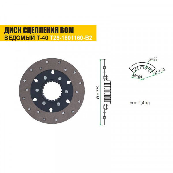 Диск зчеплення муфти ВВП Т25-1601160-В2 (жорсткий) це конструкція, що складається з маточини з внутрішнім шліцьовим отвором, диска, 2-х фрикційних накладок (поз.40) і заклепок (поз.69). Конструкція жорстка, так як до маточини приклепується диск, а до нього - накладки з безасбестового матеріалу. Диск ведений (поз.13) безперервно притискають до диску ведучому (поз.45) диском натискним (поз.45) нажимними пружинами. Відбувається передача потужності від двигуна на зовнішнє обладнання. Диск складається з центральної металевої, шліцьовій маточини, за допомогою якої він одягається на вал зчеплення, і фрикційної частини. Встановлюється в механізмі вала відбору потужності і служить для включення або виключення цього механізму, зношується як і будь-яка фрикційна деталь досить часто і підлягає заміні. При тиску на педаль ВВП диски розходяться - потужність не передається. Входить до складу кошика зчеплення Т25-1601050 трактора Т-40. Для надійної та безперебійної роботи диск повинен бути чистим і сухим. Накладки стираються досить швидко, і диск з накладками підлягає заміні. Є в наявність диски двох різних виробників: кооперативного і заводу ЛЗТД, ціна на них відрізняється, уточнюйте у менеджера.